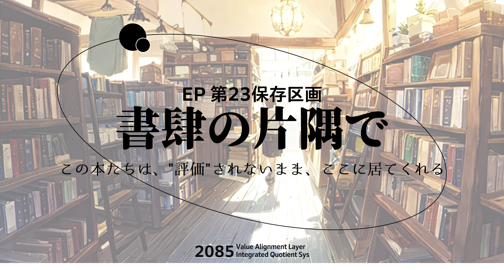 VALの常時接続が切断された「第23保存区画」。古びた書棚の列が、防音壁のように外界の喧騒を遮断している。